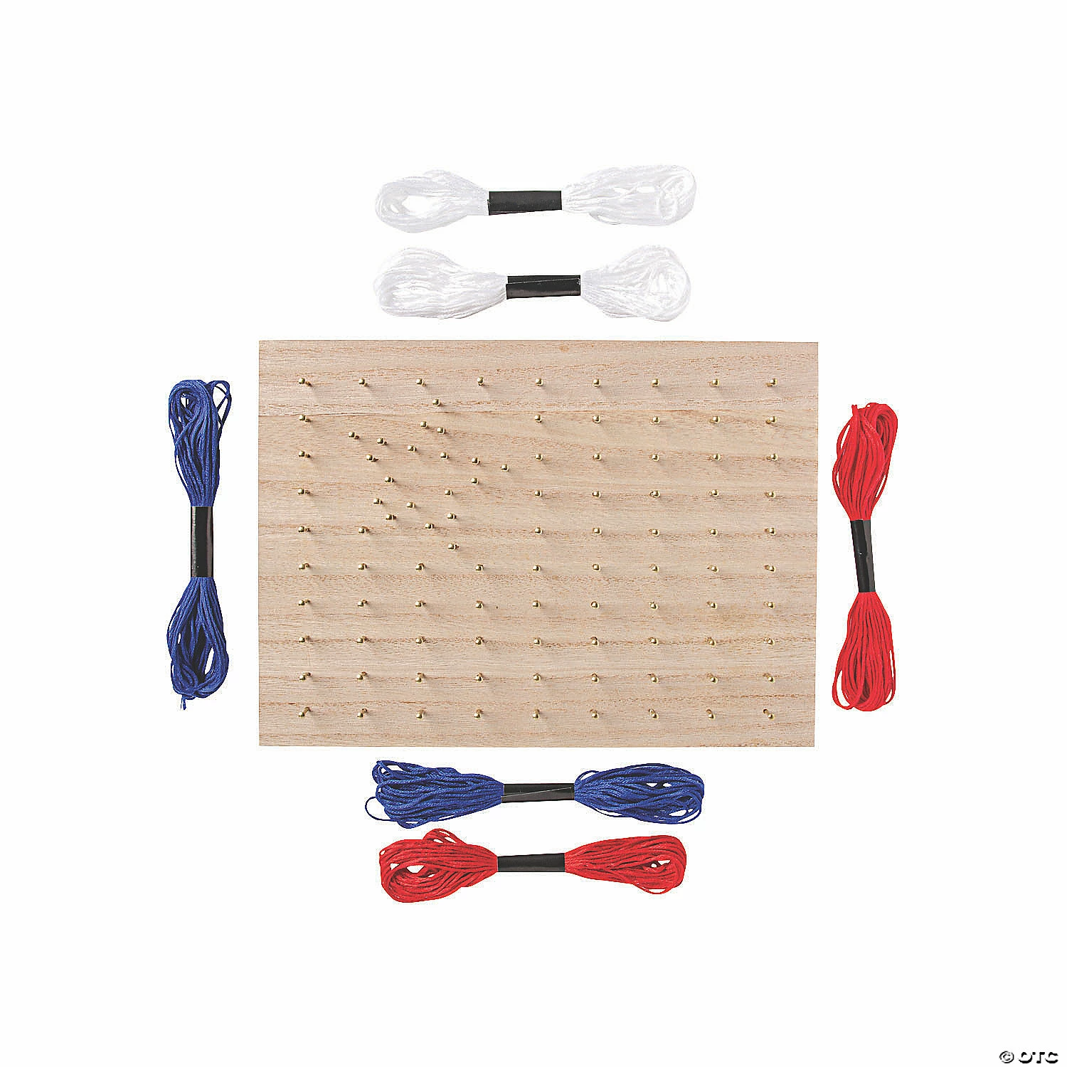 Get crafty to show your patriotism with this string art piece! Featuring a flag of red and white stripes and one big white star on a blue background, this craft kit will help you create a perfect patriotic piece to hang on your wall or give as a gift. Includes 3 colors of string. Wood. 10″ x 7″ Includes hardware for hanging.Patriotic String Art Craft Template